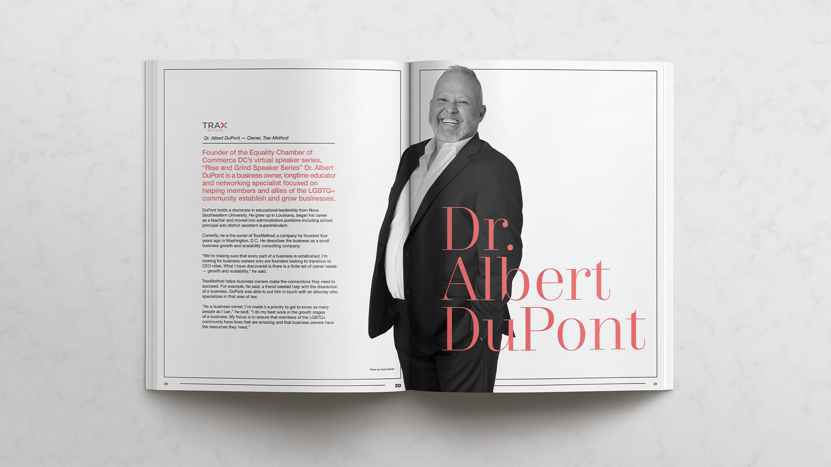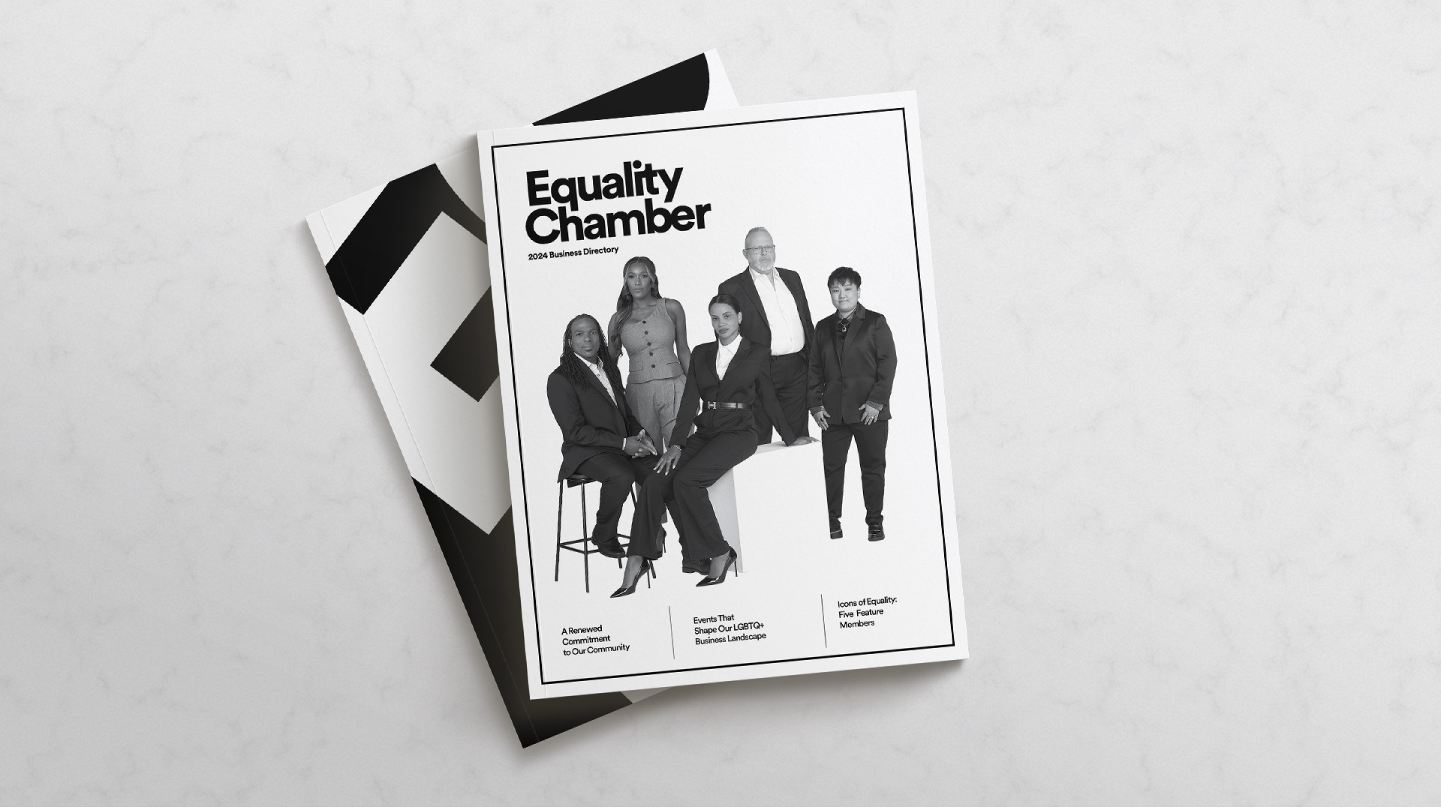 In 2023, we partnered with the Equality Chamber of Commerce, the DC chapter of the National Gay and Lesbian Chamber, to reinvent its brand identity and marketing approach. Instead of leaning on conventional Pride flag branding, we designed a system that reflects the nuanced ways LGBTQIA+ professionals succeed in corporate America, whether through assimilation or subversion. A black-and-white foundation paired with structured grids conveyed professionalism, while subtle gradients symbolized the spectrum of identities that disrupt and enrich the workplace. To bring this vision to life, we also produced a custom photoshoot for the Chamber’s annual publication, transforming it from a simple directory into a flagship industry piece that celebrates its members and their impact.