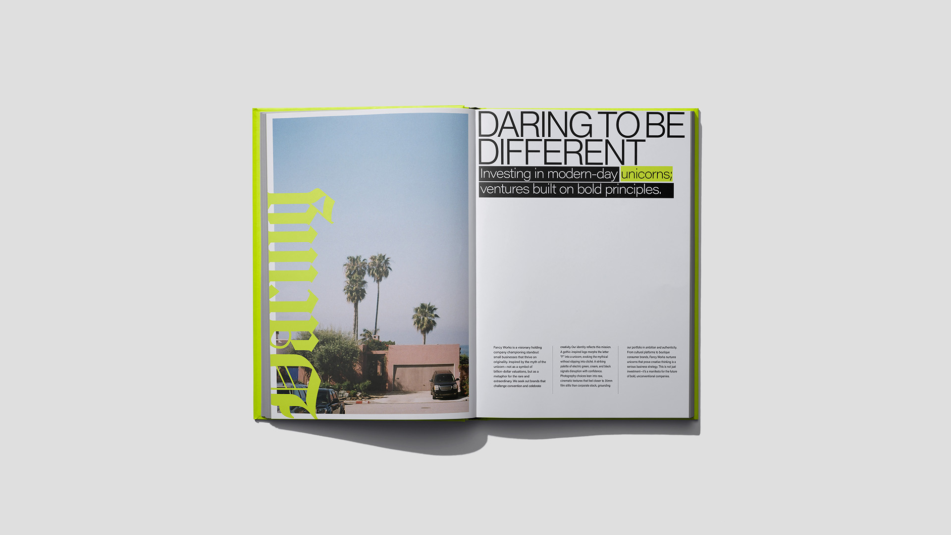 Fancy Works is a visionary holding company investing in standout small businesses built on bold, creative principles. It is their own version of modern-day unicorns. Our brand strategy leaned into that spirit, delivering a visual identity that feels confident, unconventional, and just a little mythical.